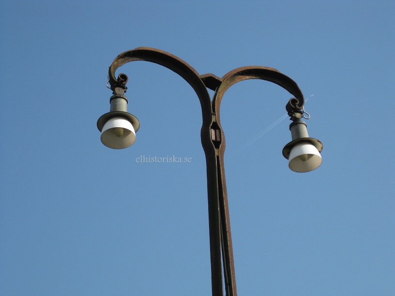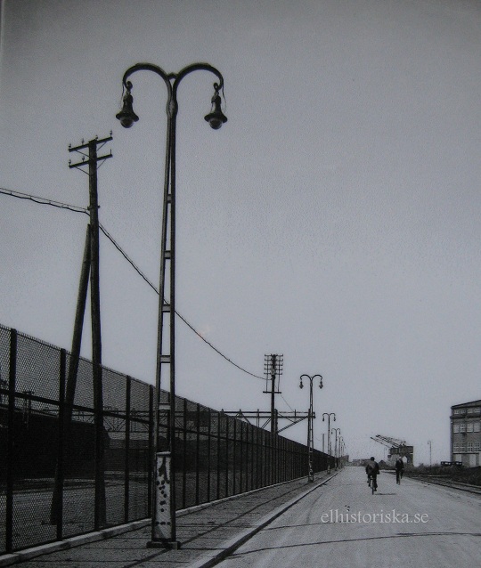 För en del år sedan ställde Tekniska museet i Malmö ut denna bild (fotoutställning egentligen), tagen en solig dag i september 1926 (svartvita). Motivet är från hamnen i Malmö. Det intressanta är belysningsstolparna, gjutjärnsbitar nitade samman till dessa konstverk med snygga krusiduller i avslutet. Armaturerna ser ut att vara båglampor.