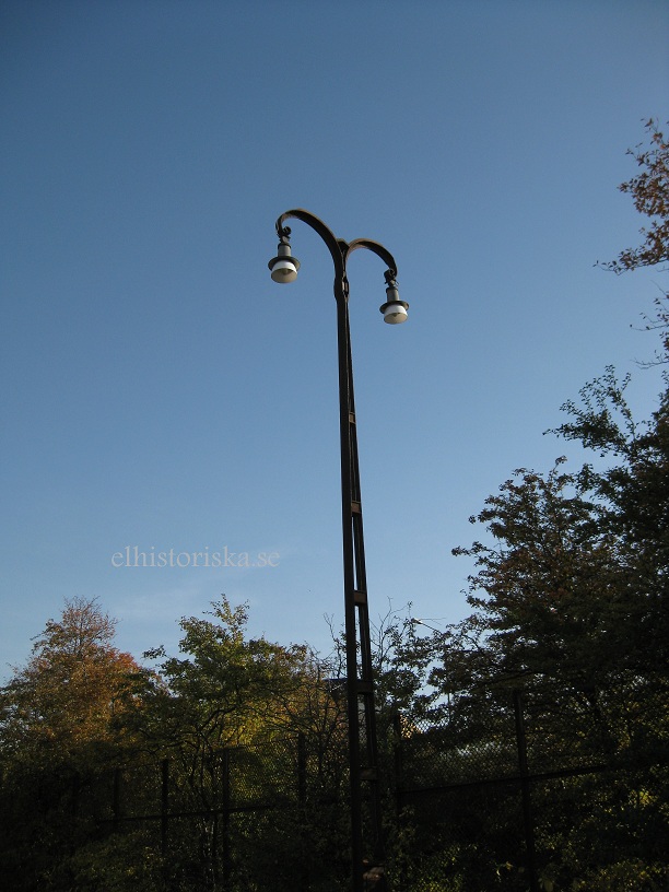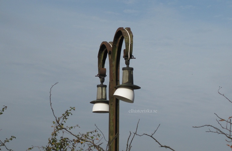 Originalarmaturerna är alls icke båglampor utan ser ut som en Siemens-modell för glödljus. Närmare bestämt Siemens bredstrålande armatur med klarglasglob L31fl - L39fl. Vilken storlek 31, 33, 35, 37, 39 går inte att säga men skulle kunna gå att avgöra fotometriskt. T ex Per W kanske kan smyga dit med tumstock och mäta någon lätt identifierbar del av stolpen, exempelvis gapet mellan de två nedersta tvärbalkarna?
