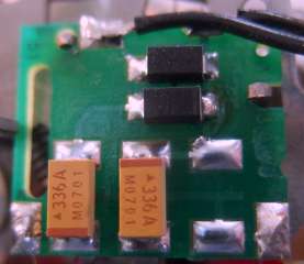 Ja, något liknande. Men min minnesbild är att det fanns några trebenta ytmonterade komponenter (transistorer eller dubbeldioder) där, och jag känner inte riktigt igen att det skulle ha funnits några gula tantalelektrolyter. Det hela verkade i varje fall mycket symmetriskt uppbyggt, man skulle kunna tänka sig två identiskt likadana kretsar som ska ta hand om positiv respektive negativ halvperiod.