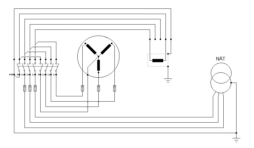 Det viktiga i det här exemplet, är att 0 är ansutet till elverkets noll och den inte är ansluten till jord. Där emot är elverkets jord anslutet till elbolagets.