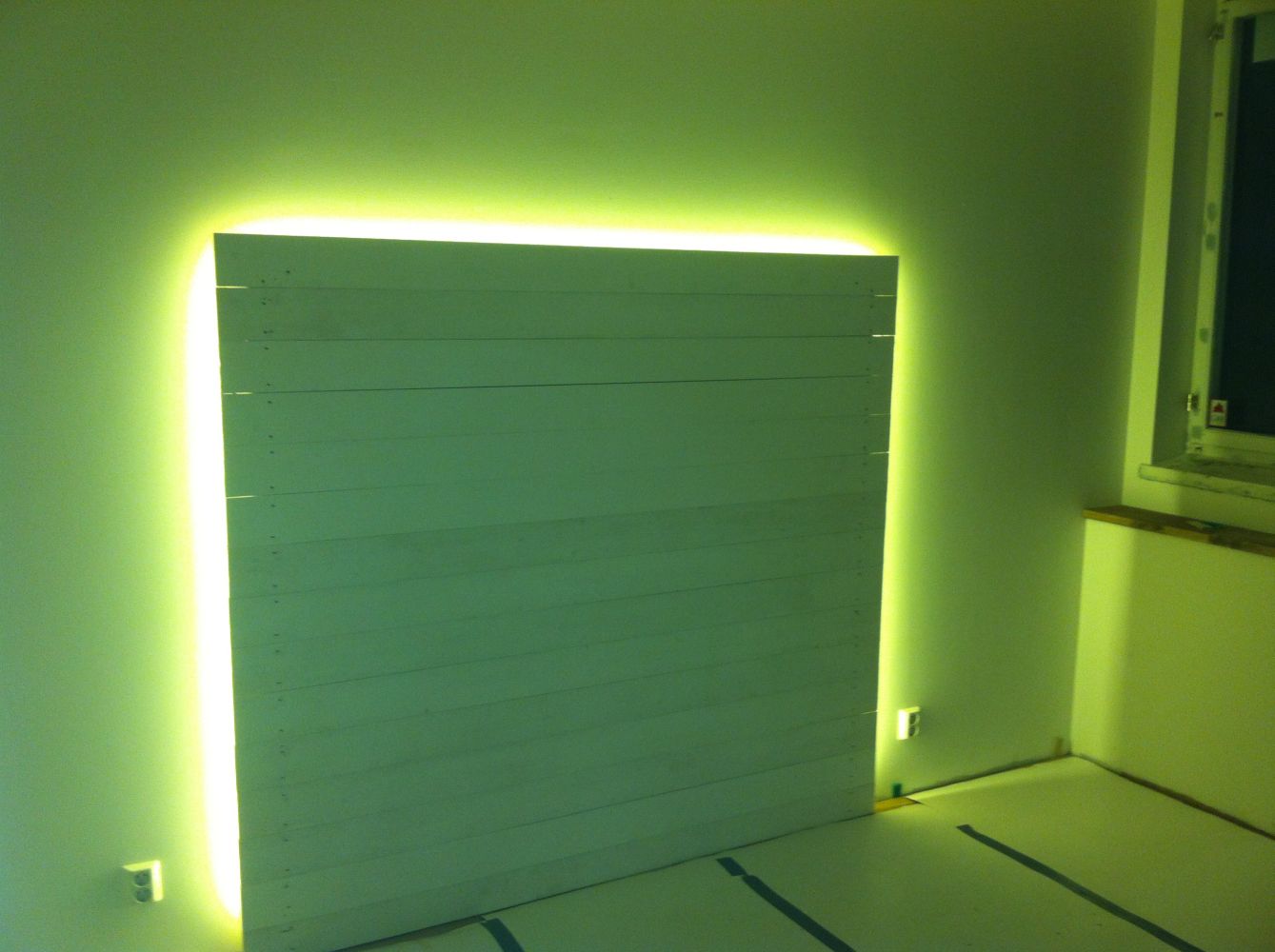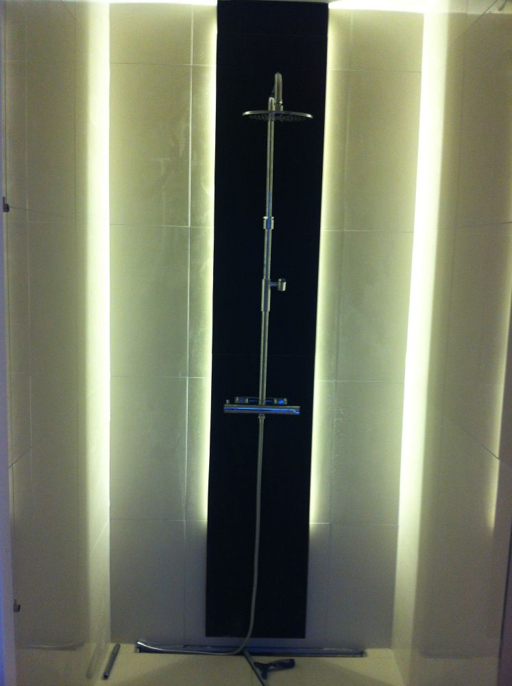 Duschrum, 2st IP-klassade led-lister på vardera sida om fondväggen. (På bilden sitter det 2st provlister som va "Lite" för korta, dom är i dagsläget ersatta av 2 nya i rätt längd)
