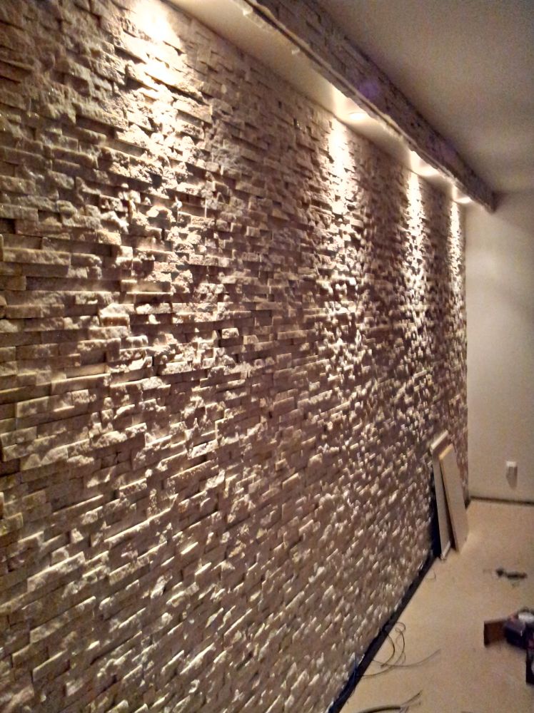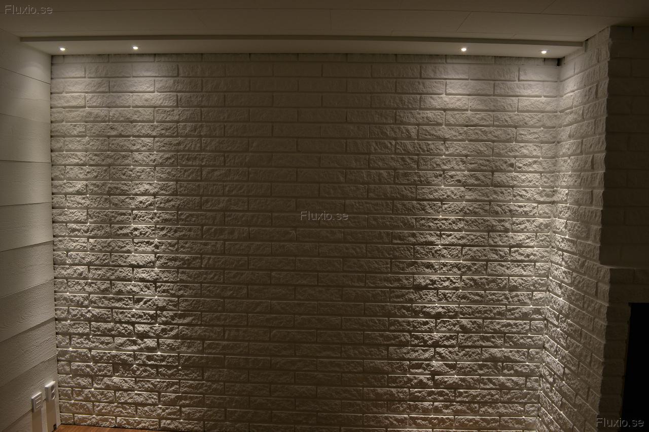 Små LED-spottar monterade som "vertikalbelysning" på en grov panelvägg och en tegelvägg i en källare. Mellan spottarna på tegelväggen så ska det rymmas en TV!