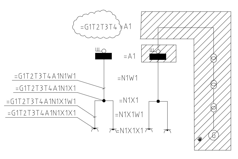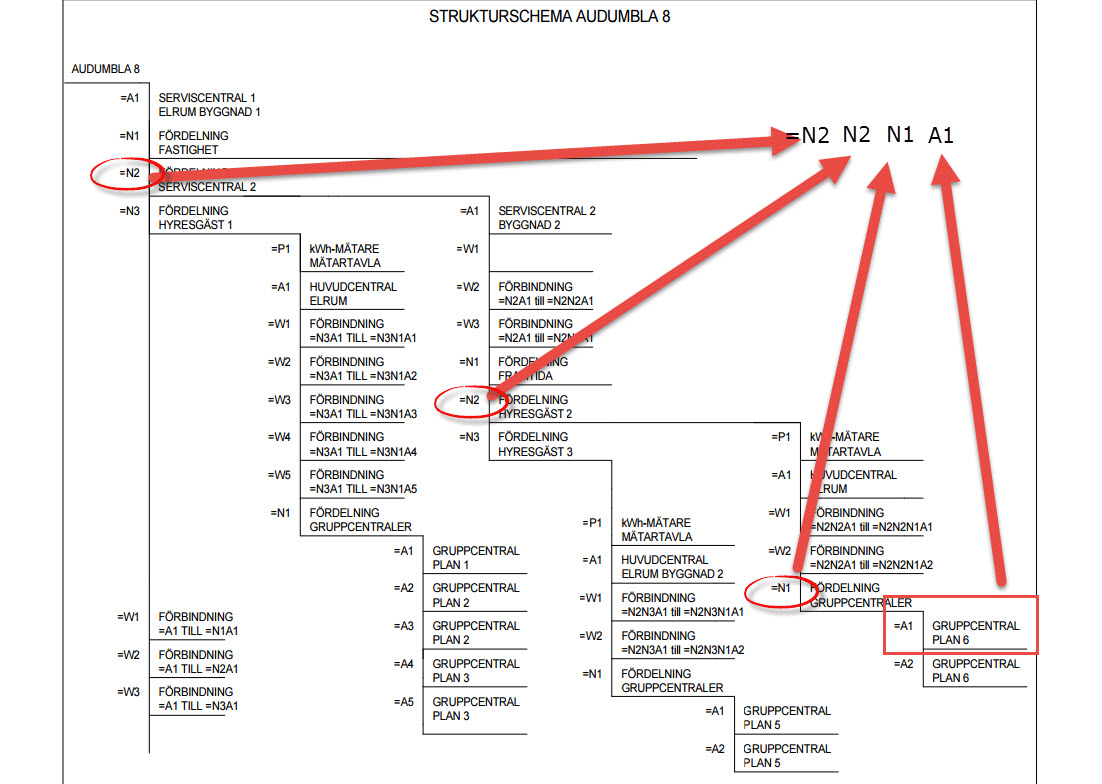Första centralen heter =A1, men eftersom alla gruppledningar kommer att komma från =A1 kan man säga att den inte är relevant för märkningen. Därför räcker det med att första fördelningen =N1 samt första ledningen W1 utgör gruppledningen =N1W1 ut till första dosan =N1X1, från den dosan går en ledning =N1X1W1 till uttaget =N1X1X1