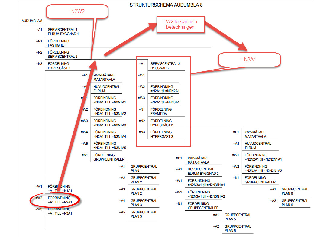 Ledningen som är redovisad nere i vänstra hörnet är egentligen ledningen som går bort till centralen =N2A1 men man valt att placera den där för att när man bygger beteckningen för =N2A1 så försvinner kabeln =N2W1 mellan =A1 och =N2A1...