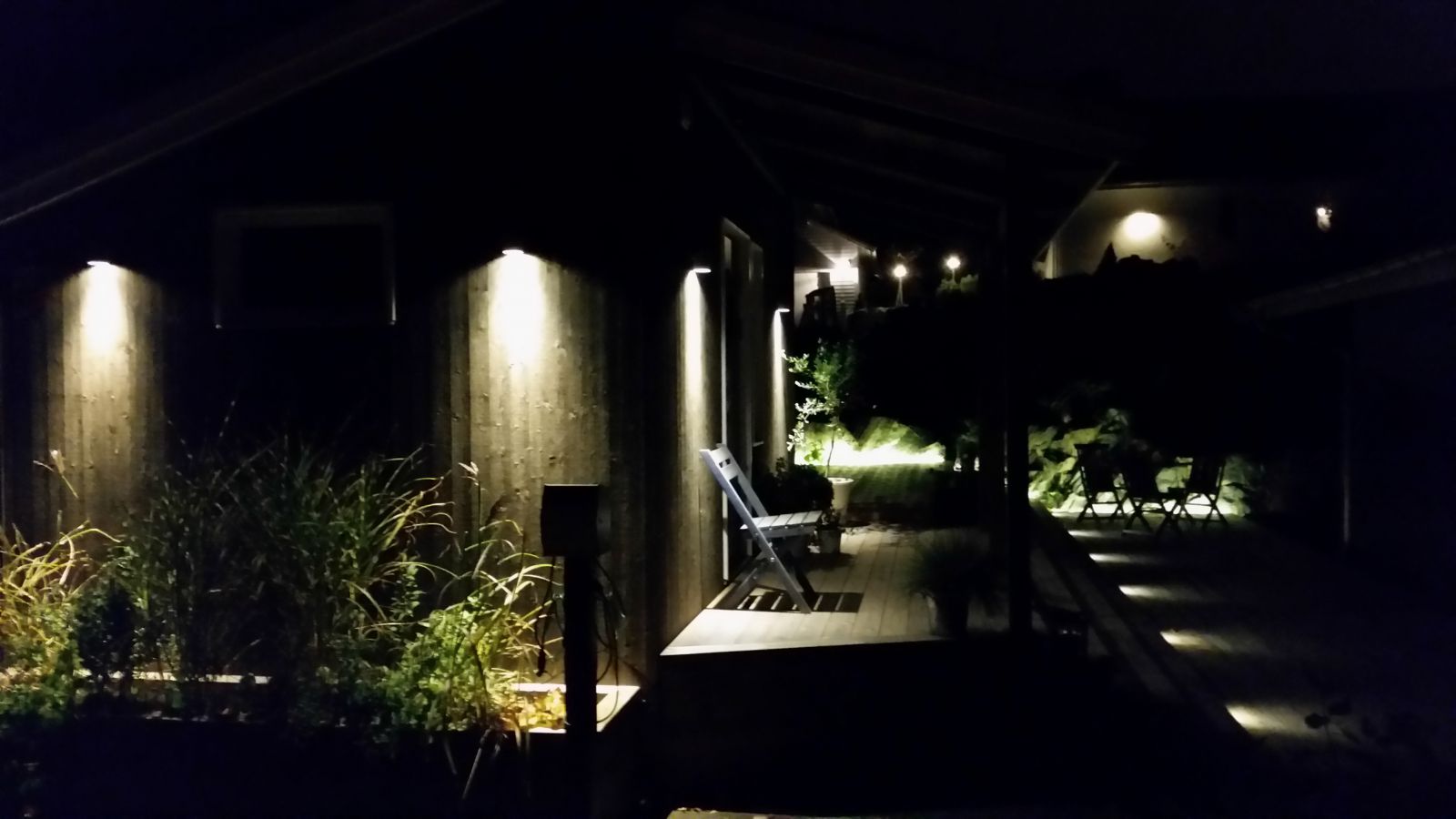 2st markspottar med spett längs långsidan på uterummet och utanpåliggande spott i husets takfot. Tegel och ojämna ytor är i regel roligare att belysa än en träfasad.