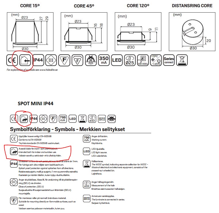 Så här visar tex. Hide-a-lite det på sina armaturer men vet inte om symbolen gäller för alla. Båda är ip44 men endast en för utomhusbruk.