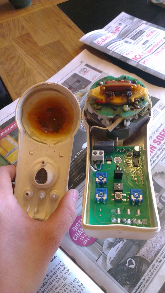 Hade en brun sörja som en ring runt allt ihopa. Hade en billigare ersättare mot den begagande dyra som ersattes men fläkten är den samma så endast kretskorten somskiljer. Även solfjäder eller inte är bara att byta fritt imellan.