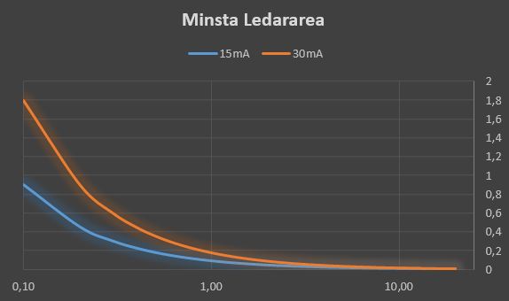 Skulle strömmen överstiga 5A så krävs en klenare ledare. Orimligheten ökar alltså i takt med att belastningsströmmen för huset ökar. Kurvan skulle se ut som bilden nedan. Jag har även tagit med kurvan för 15mA eftersom jordfelsbrytaren enligt standard får lov att lösa vid 50% av dess märkström.