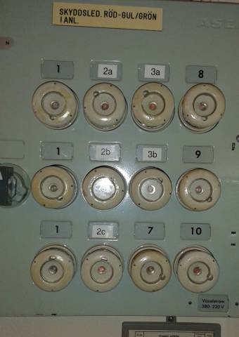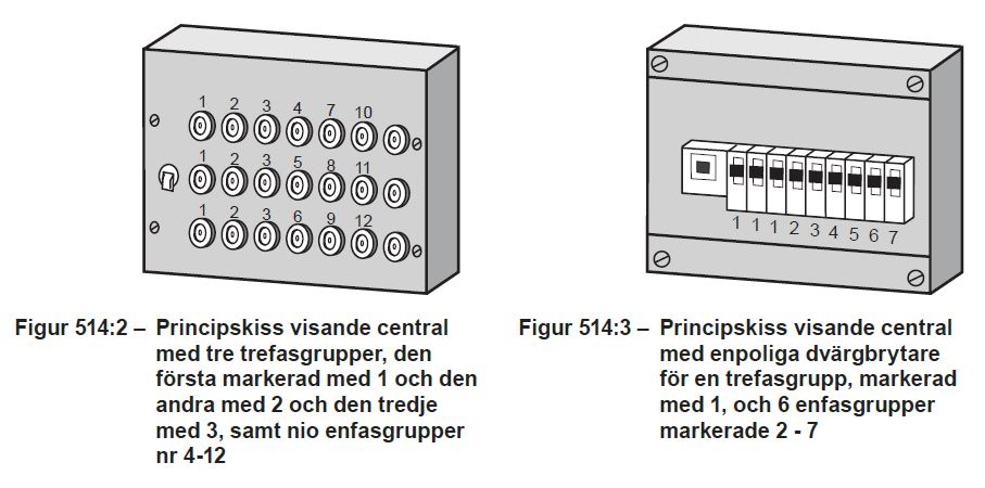 I figuren utgör grupperna 1 – 3 trefasgrupper och 4 – 12 enfasgrupper. I centralen angivna nummer hänvisar till en i centralens närhet uppsatt förteckning. På en sådan förteckning bör i förekommande fall lämpligen anges vilka grupper som är två- eller trefasgrupper.