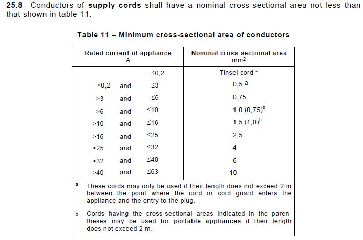 Nu har jag ingen modern upplaga av dessa standarder tillgänglig, men i en gammal 60335-1 finns följande tabell för area hos anslutningskablar.