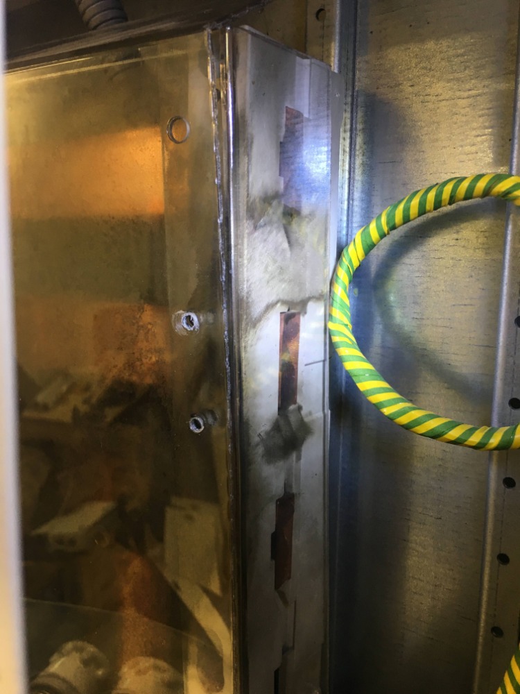 Överslag har skett precis intill ett ställe där skruvar dragits rakt in i skenhållaren. Självborrande skruv har använts på flera ställen i centralen, så i botten av centralen finns det (i mina ögon) gott om spånor, skruvar och rester av installationsmaterial. Elinstallatören har av skåptillverkaren fått nytt material till beröringsskyddet tillsänt utan kostnad.