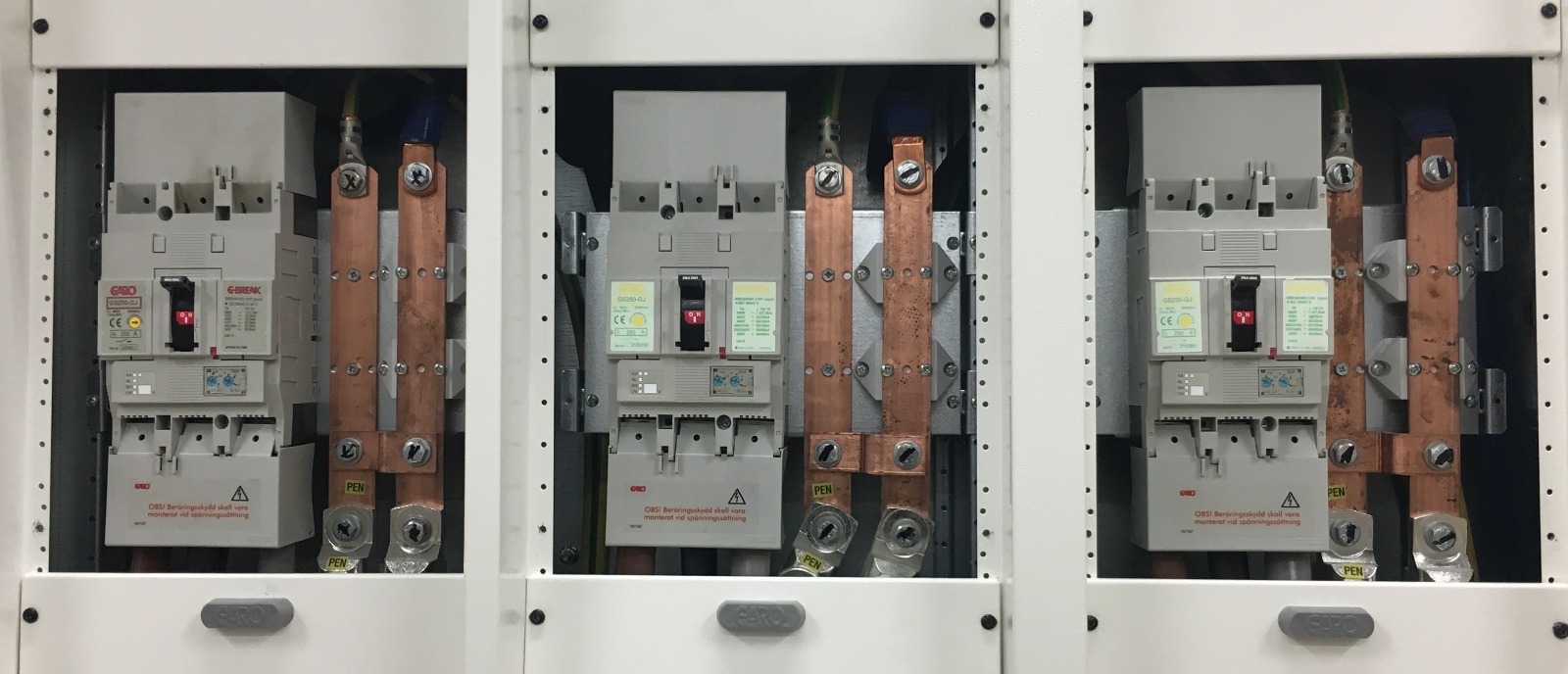 Inkommande effektbrytare, den längst t.v är sotad. Har noterat att färgen på etiketterna på brytarna är olika, serienummer skiljer en del. Dock är brytarkaraktäristiken angiven på nästan samma vis. Modellen av brytare (GS250-GJ) är densamma: