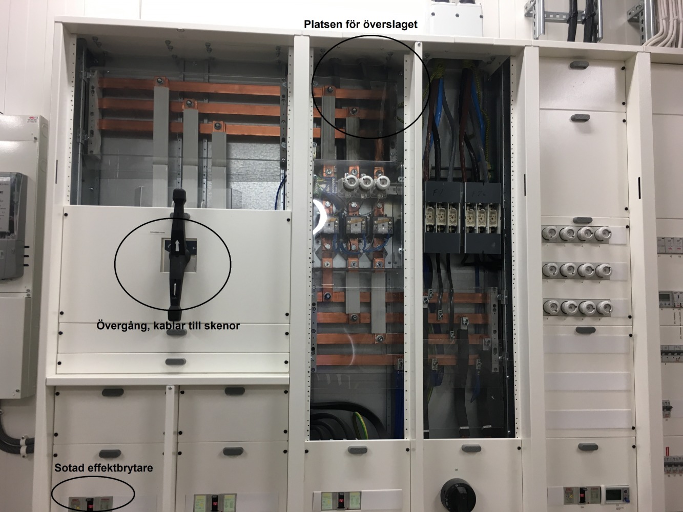 Anläggningen är ritad och byggd av Garo, ca 4 år gammal, märkt 750A. Inkommande serviser, 3st AL 240mm2, 750A. I samband med ett mätarbyte upptäcktes att det har smällt till inne i elcentralen. Vid efterföljande elrevision enligt EN, anmärktes så klart på skadorna. Firman som installerat var ute och undersökte men kunde inte ge definitivt svar på vad som hänt. De kunde dock se att beröringsskyddet var märkligt monterat, men såg inte att det skulle kunna orsakat skadorna. Bästa teorin blev därför blixtnedslag.