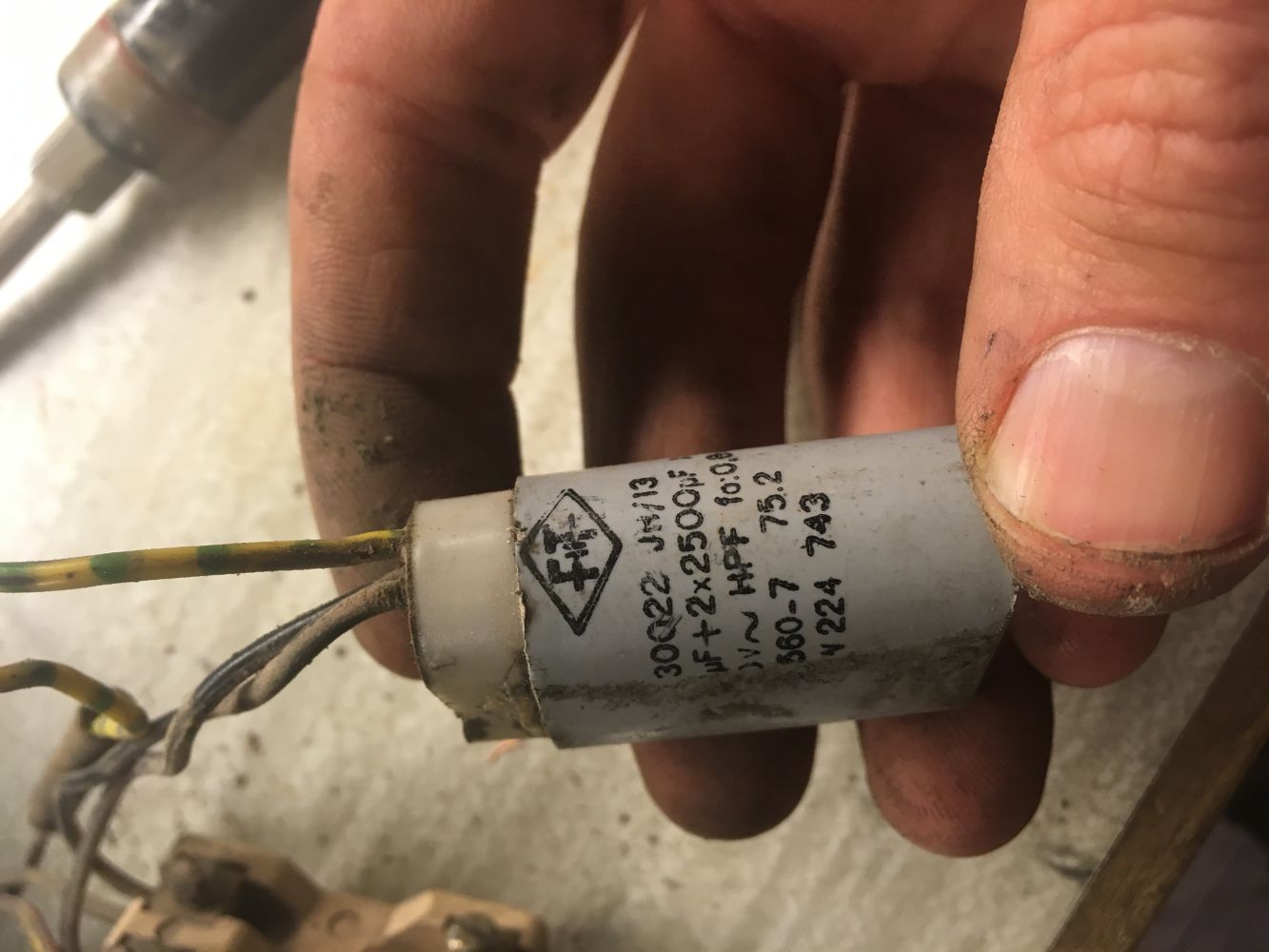 Egentligen tre kondensatorer i samma kapsling - en större (X-kondensator) mellan fas och nolla och två mindre (Y-kondensatorer) mellan vardera ledaren och jord.