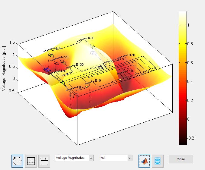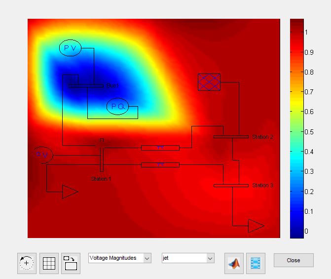 Bilden ovan visar spänning i ett nät i per unit exempelvis. Ledningar representeras av pi-länkar o.s.v.