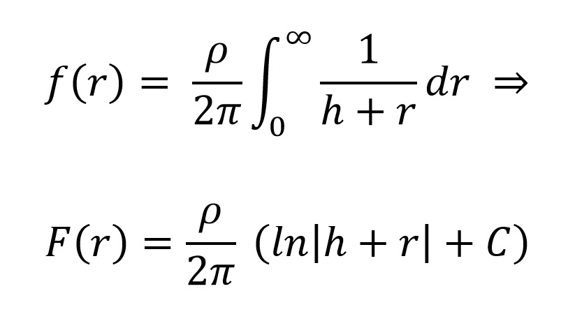 Jag antar att man skulle kunna göra en analogi till radiell värmestrålning och integrera skivvis längs h istället och sedan sfäriskt från botten av jordtaget. Då skulle jag bara kunna byta lambda mot rå och 1/U mot R.