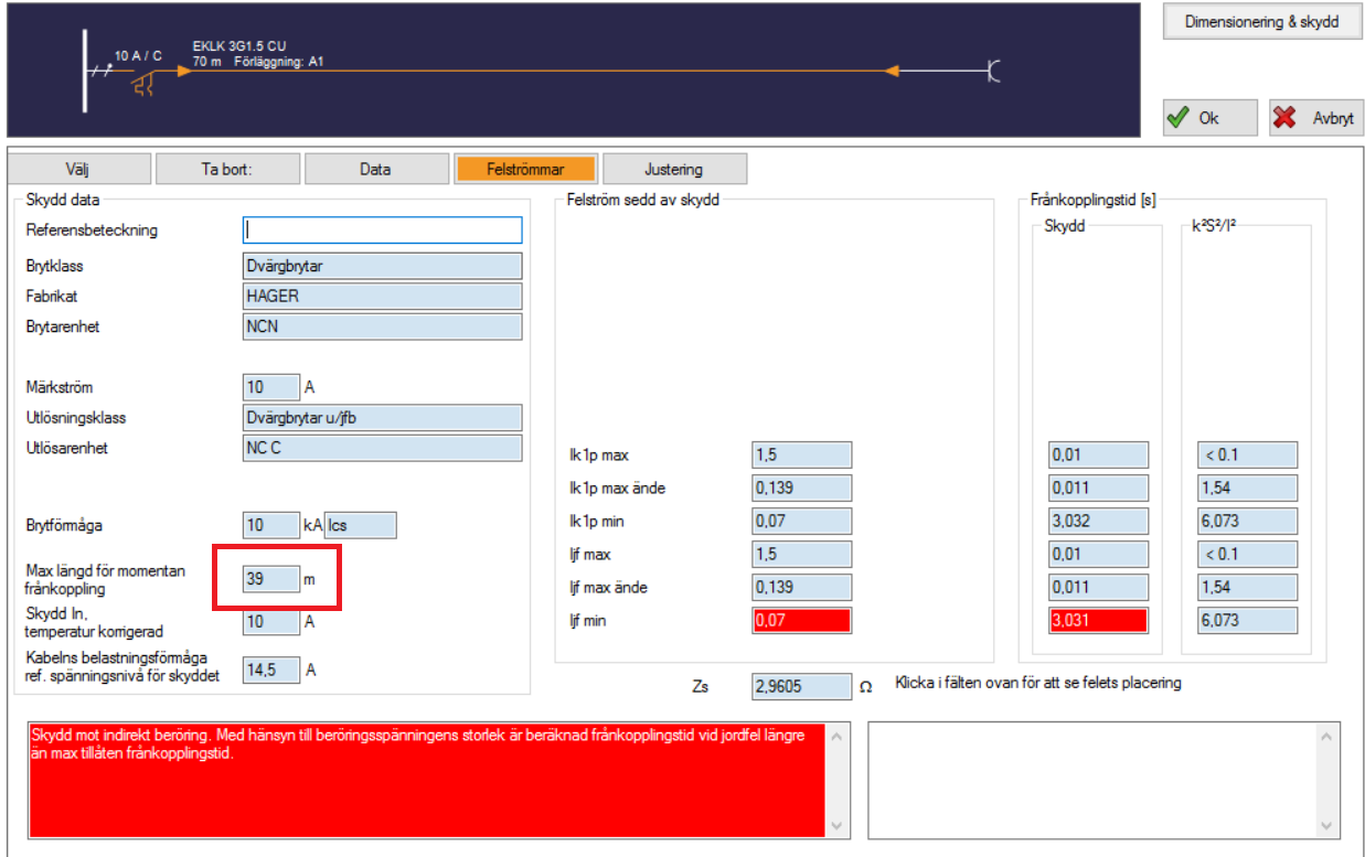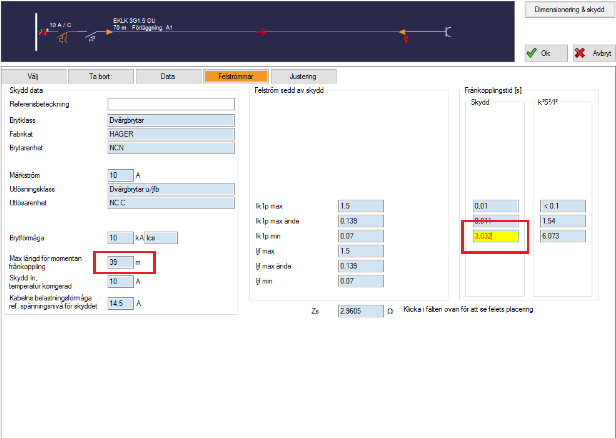Sant, jag bifogar ett exempel där ena bilden har jordfelsbrytare inlagd, andra utan. Man kan se att längden (39 meter för momentan frånkoppling) inte ändras, men Febdok godkänner installationen vid 3 sekunder p.g.a. jordfelsbrytare är installerad. Jordfelsbrytaren visas längst upp i vänster (på översta bilden) på ledningen, bredvid dvärgbrytaren.