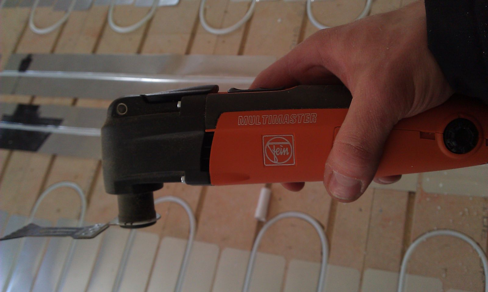 Renovering av gammalt hus, taken reglas ner och en gammal infälld gjutjärnsdosa ska bort. Jag "feinade" litet smalt spår vid varje studs, "feinade" av pansarrören, slet ut dosan och kan då enkelt skarva på rören med ny slang. Blev minimala hål i taket så var inte så mycket spån som ramla ut.