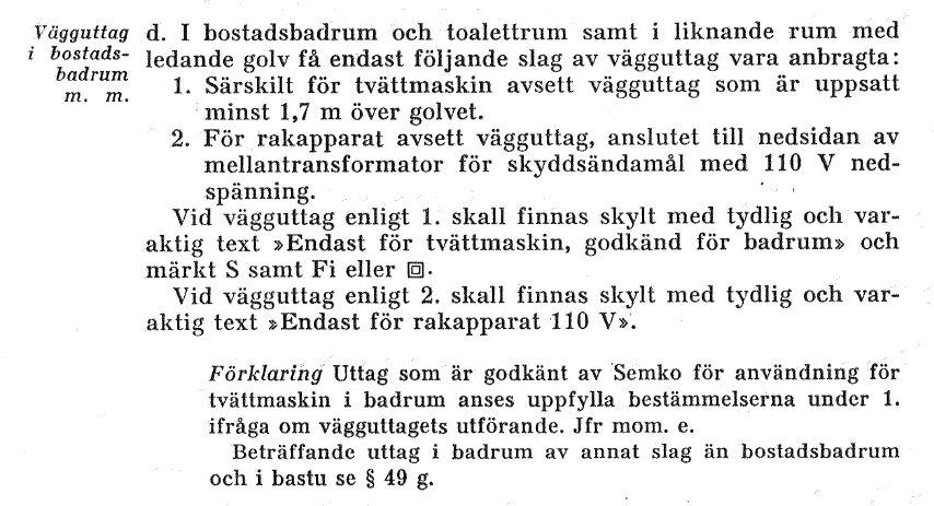 Som en parantes kan jag tycka att det är intressant att det har varit tillåtet med 230V eluttag utan jordfelsbrytare i badrum i bostadshus. Om den bara används till tvättmaskin!