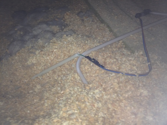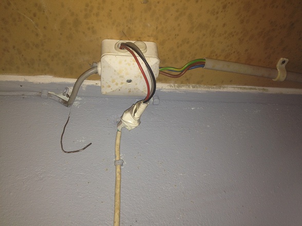 På vinden hade man visst skarvat kablarna som blev lite korta, detta låg löst i spånet...