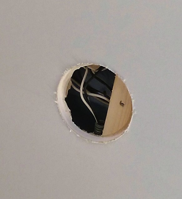 Förra ägaren hade reglat upp under de gamla innertaken och satt upp nya brädtak (för att inte säga lockpanel), tagit upp en massa hål för spottar men INTE passat på att få fram några kablar när man kom åt, de gamla lamputtagen går inte heller att komma åt om man inte river bort den nya panelen.