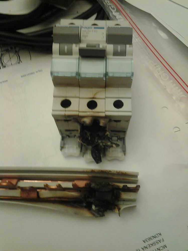 Åkte på ett akutjobb imorse där en säkring hade löst, det luktade väldigt bränt och lampor blinkade. Lyfte av kåpan och upptäckte detta och en massa blixtrande. Tur att det är självslocknande plast som bara kålar och smälter och inte brinner...
