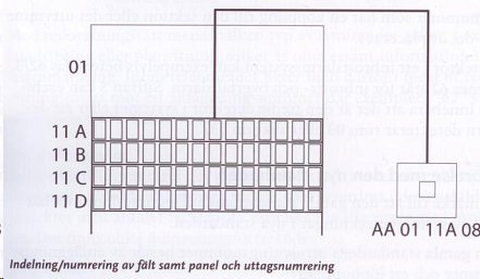 - ...är beteckningssystemet uppbyggt på ställ, fält, plint eller panel samt klämma eller uttagsnumrering och i vissa fall utrustningsnummer
