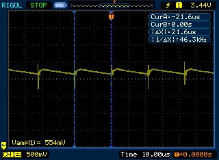 ca 45kHz överlagrat på utgången, runt 500mV amplitud.