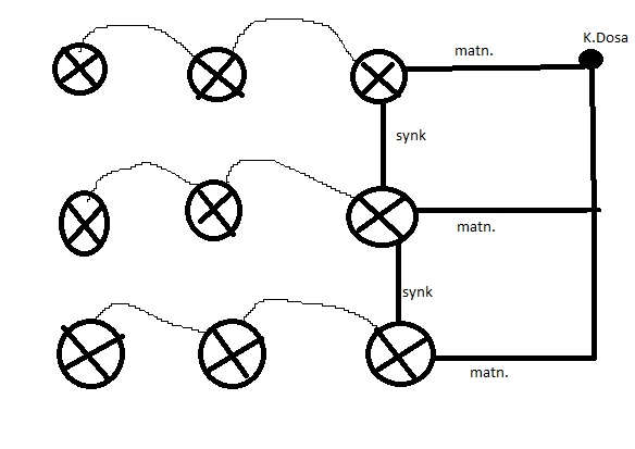 1st Master matas med tändtråd från tryckknapp med fjädrar i, och N. 3st slave enheter matas med fast fas och N samt alla kopplas ihop med sync kabeln som då reglerar ljusstyrkan på alla enheterna från mastern.