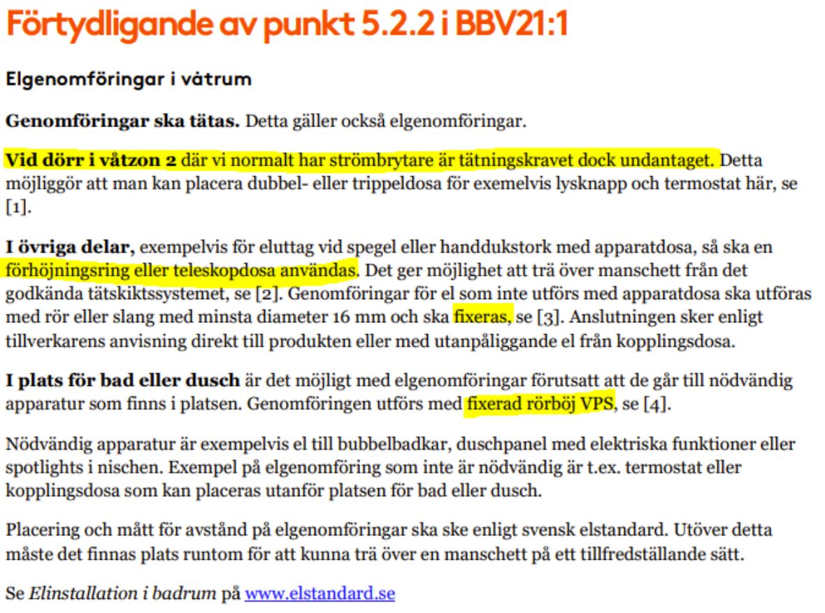 Alla dosor för t ex uttag måste vara med teleskopring för att det ska gå att trä över tätningsmanschett. Två eller fler dosor i kombination får endast sättas vid dörr för strömbrytare/golvvärmetermostat. Detta måste ju även innebära att ROT-dosor blir förbjudna (finns ju inte med teleskopring)... annat än bredvid dörren till strömbrytare osv.
