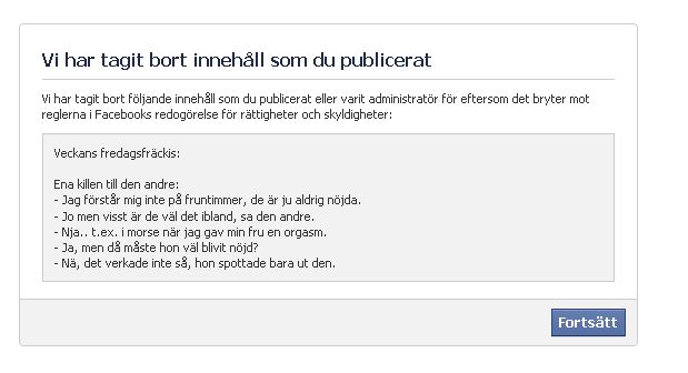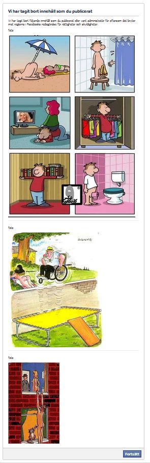 Följande bilder (och sist ett textinlägg) har klassats som olämpliga enligt Facebooks regler (De första bilderna kan jag kanske förstå, men sen är det ju verkligen helt harmlösa bilder... helt sjukt!)