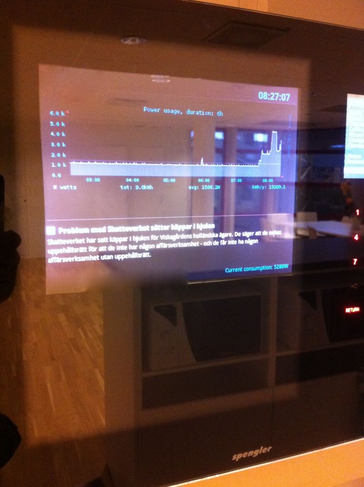 Gjorde nyligen ett kontor där kunden hade önskemål om att mäta elförbrukningen. Vi drog fram kabel från deras serverrum till elmätaren där de själva monterade mätutrustningen för att sedan presentera mätdata på en skärm inbyggd i deras kaffemaskin