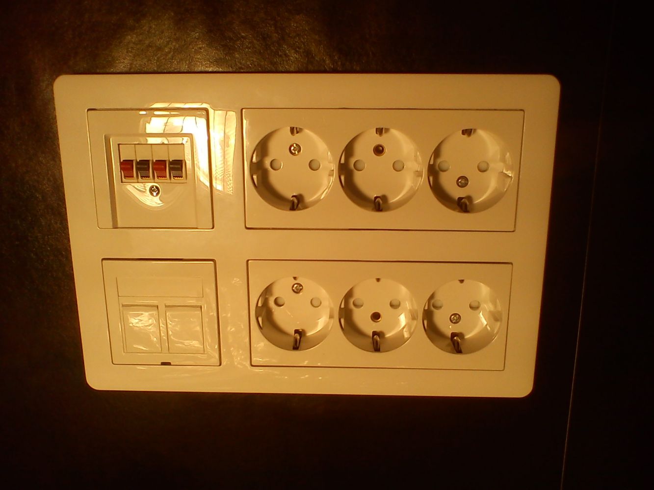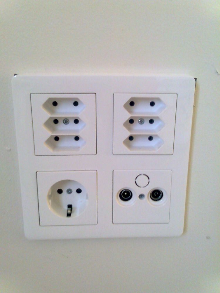 Ev. så ska jag inte tillbaka. Kunden har byggt själv och sågat upp för stort hål runt det hela (även använt T75-dosfräs för vanliga apparatdosor så att Renova brytarna åkte in i hålet helt). Kunden får försöka spackla och måla runt. Är det svårt så ska kunden ringa. Just nu är det svarta springor på bägge sidor, men som inte direkt syns på bilden.