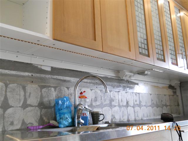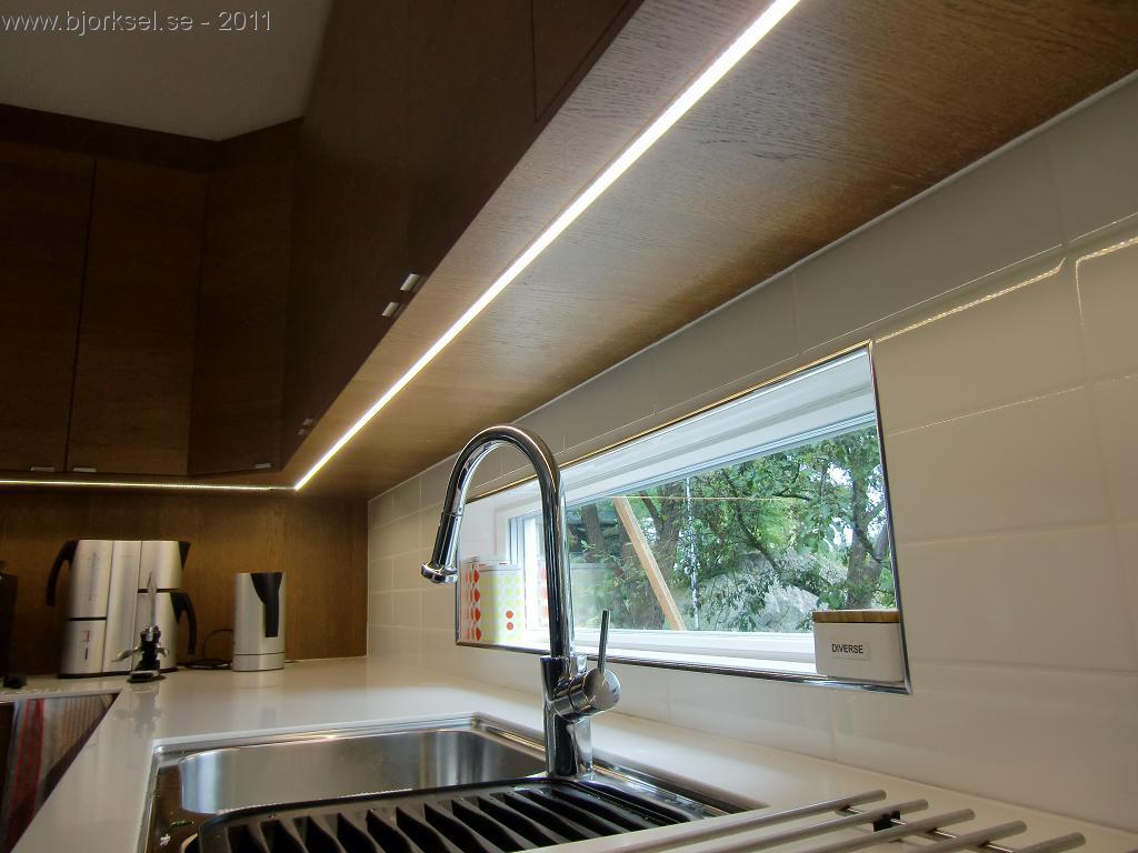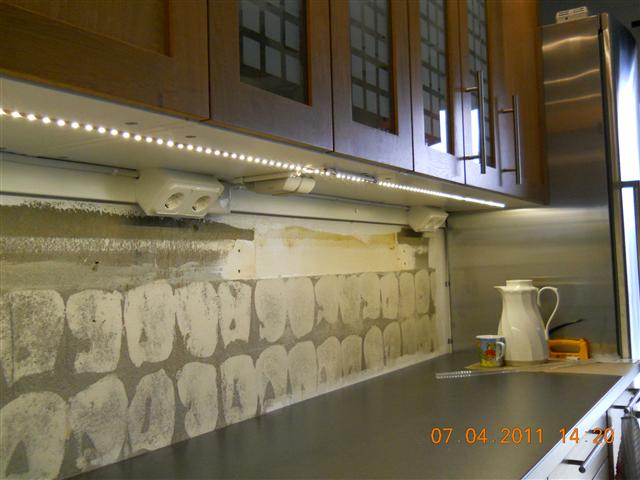 Nu har jag installerat min första LED-strip i ett kök. Hade först installerat halogenspott-skenor, men som det visade sig gav alldeles för dåligt ljus. Rev då det och satte upp en tejp. Blev jättebra ljus, MEN på den rostfria diskbänken så blev det massor av vita ränder. F*N!