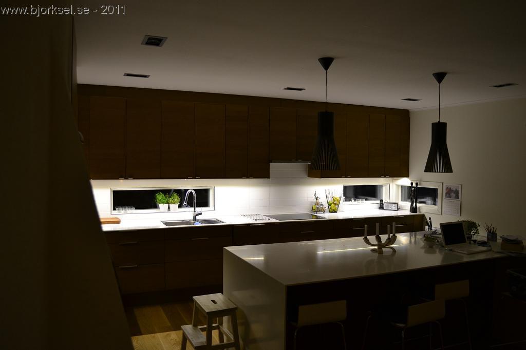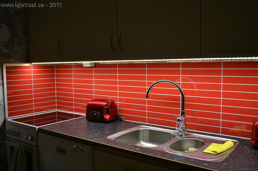 Här har vi bara tejpat fast den direkt under överskåpet (Detta är på firman, som test) Om man tittar på den rakt från sidan så blir man lite bländad, eftersom det är stor (120° tror jag) spridning på ljuset.