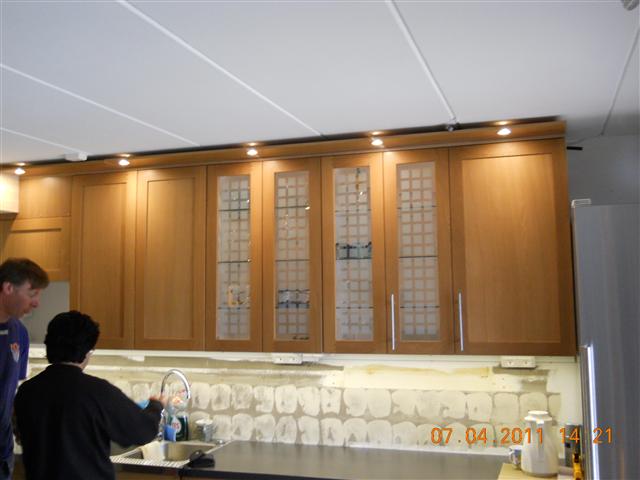 Att fräsa in i en "baldakin" (lös skiva under) innan man monterat den är inte så märkvärdigt jobb för en snickare. Men vi försökte även att fräsa in direkt under skåpet (utan baldakin), efter det var monterat och klart. Snickarn svor ganska högt över detta! Inte så kul.. Och det blev inte lika bra heller..